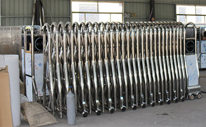 一扇好的不锈钢伸缩门锁具是很重要的,不可随便以为铁的、不锈钢的、铝合金的门就可以,也不要片面追求豪华、美观而忽视了防盗门的质量.防盗门表面上看都是钢铁做的,其实材质上却有着很大的区别,锁具要选用锁舌锁头多保险功能的防盗锁,室内外都能开启或锁定,并在门上安装门锁保护铁板,使无钥匙者难以撬动.合格的防盗门锁里有防钻装置,锁的结构是防撬的,劣质品用的是普通门锁,无防装置,结构简易,手电钻一摇就开。